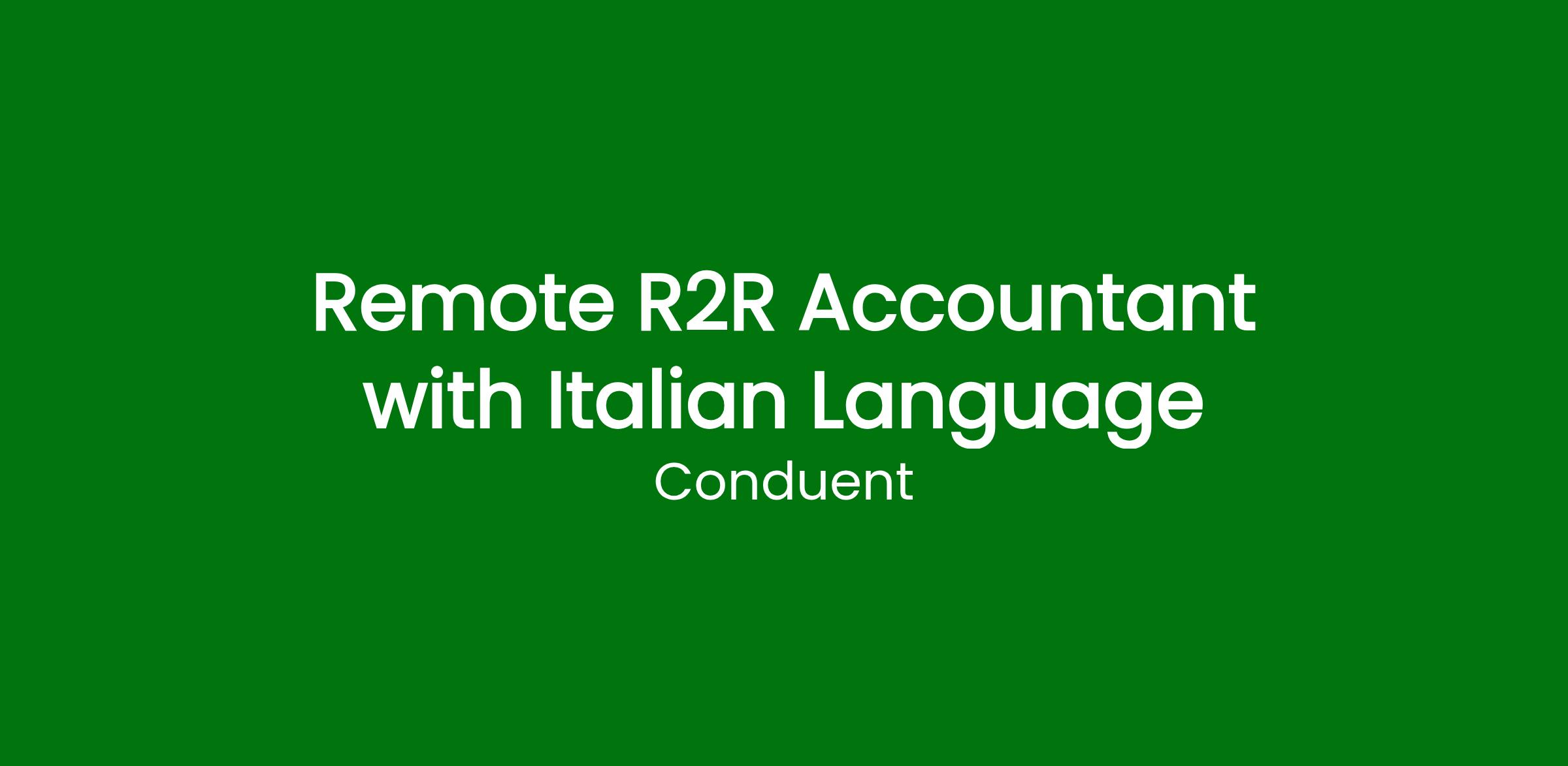 DescriptionWe are excited to announce that our team is expanding, and we are looking to hire talented individuals to join us. Currently, we are seeking an Remote R2R Accountant/Accounting Analyst with Italian Language (R2R) to support our growing operations. If you are detail-oriented and fluent in Italian, this could be a great opportunity to advance your career with us!